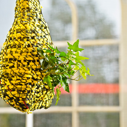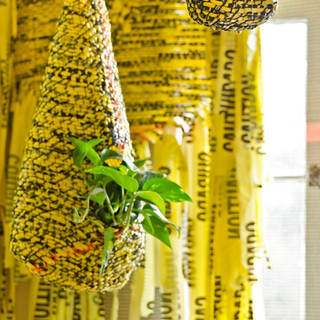 Tucked away in the corner of the gallery, Gallo covers the room with caution tapes and plastic bags to mimic a beehive. The aforementioned tape takes in multiple silhouettes whether it be drops of honey or a basket for the house plants. Yellow plastic bags are folded into the shape of a honeycomb. A black debris net is used as backdrop to weave the materials. While the room has a view of the garden, natural sunlight penetrates the space.