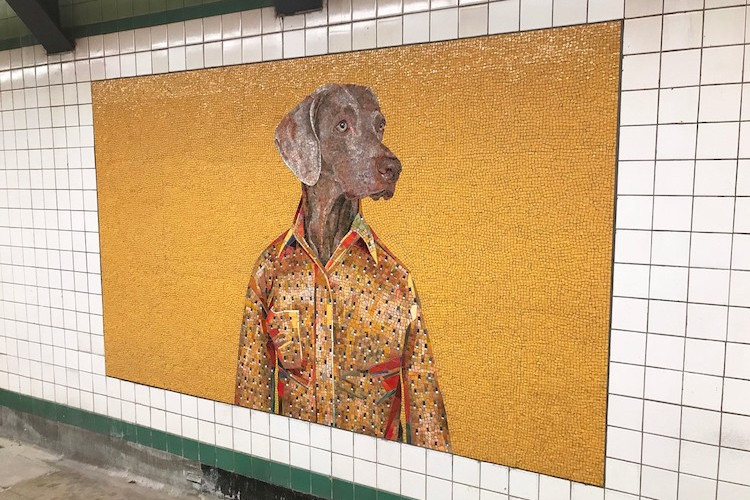 After dressing and photographing the dog William relied on Mayer of Munich to fabricate mosaics and he skillfully turned grey stones into grey dogs. The walls of the station will never be same again and the commutes in the NYC subway station are now a little brighter, a little relaxed and obviously appealing.