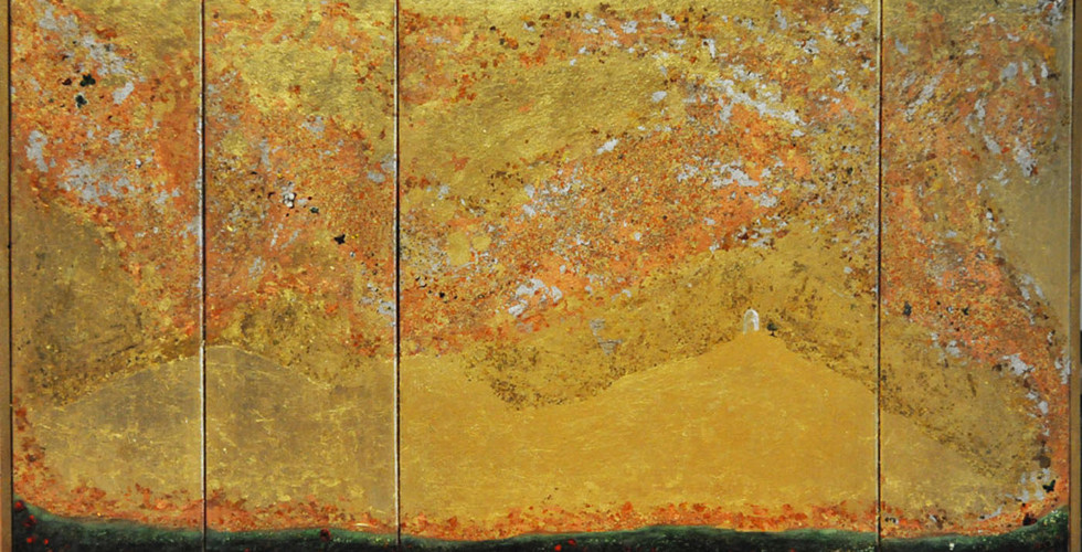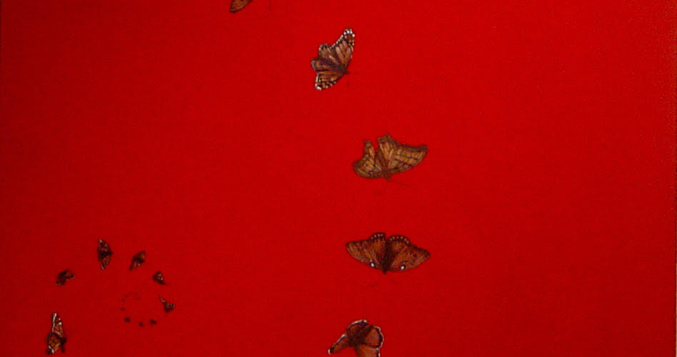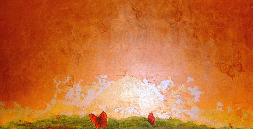 “The Butterfly Effect” examines, as the artist explains on her website, “the butterfly like a soul seen through the passage of centuries in ancient civilizations and religions; like heaven as the bright and eternal abode of every soul, the energy center to which the soul returns, is reborn, and continues the circle of life to infinity”. To do this, she mingles different approaches and media. The pieces are titled with dates as though they are steps on a journey. It prompts thought on how things change over time and may be experienced differently at different stages in life. To miss one image in the series might mean missing out on a leg of the visual journey through life. The images weave in and out from a very decorative approach, as in “Butterfly Effect apr 1”, “Butterfly Effect apr 2”, and “Butterfly Effect apr 3”; to works reminiscent of ancient mountainous landscapes such as “Butterfly Effect apr 7” and “The butterfly effect Apr 10”; to the colorful explosion of Klimt-like glitter in images “Butterfly Effect apr 9”, and “Butterfly Effect apr 12 ‘. Reds and oranges are introduced throughout, but come to full power in images “Butterfly Effect apr 7” and “Butterfly Effect apr 8”.