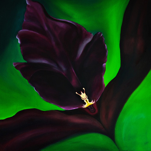 In the “Creation” series, color, form, and surface unite to celebrate sexuality and sensuality in organic shapes that mesh human and floral forms. There is a playfulness to the images that bring pause to remind us to let the mirth in. Ms. Koraki does not hide the sexual connotation as phallic symbols intertwine with more female formations of petals and leaves. The surfaces are tactile; the palette is alive with passionate reds beating with intensity and desire, with illuminating golden hues offering thoughts of hope, light, and life. Works such as “Focus” and “Arsenokoiths” are reminiscent of Georgia O’Keeffe’s “Black Iris” and “The Blue Flower” in composition and color, as well as the interplay of female and male sexual forms. “Krinos” pays tribute to the photographic work of Robert Mapplethorpe and images such as “Calla Lily” (1982) and “Tampa Orchid” (1985). Ms. Koraki’s works show the same intense focus on a single form, pulling the viewer into the sinewy lines and colors, and vision of beauty and the energy of the soul tying into the world of nature and the eternal mystery of element and form.