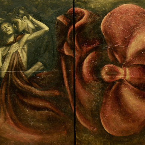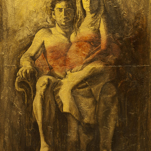 “Lightbodies” is a collection of theatrical figures posed to dramatic effect. The lighting and treatment is reminiscent of the artist Nikolaos Gyzis’ works such as “The Spider” and “Behold the Celestial Bridegroom”. Man and woman appear alone and entwined like Adam and Eve. In“lightbodies_4”, passion is emphasized by the orchid’s presence, symbolizing love, beauty, and fertility. “lightbodies_3” shows the couple sitting, the woman’s belly suggesting a birth on the way - a smear of red across their torsos indicating passion, union, the fluid of life - bonding the couple together.