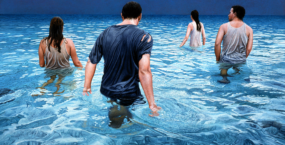 Cross sets his scenes among recognizable flora and under familiar skies, yet the isolation of it all throws the viewer off kilter. When Mark places figures into these places, the narrative begins. The people he depicts are somehow innocent compared to the land they are inhabiting. There is a harmony between the figures and the sea, shoreline, meadow or rocky outcrop they interact with in the paintings- a supposed harmony that seems to imply an impending disruption. Mark’s paintings carry the tranquility of a calm before the storm. The human bodies, isolated and delicate against the backdrops, become vessels for the story of the land stretching out behind them. They are futile, oblivious, and natural. This becomes both an ecological and environmental narrative about balance, and it seems that no part of the imagery in Mark’s work will remain permanent. The tide will retreat, the figure will fade, and the horizon line will blend into night.